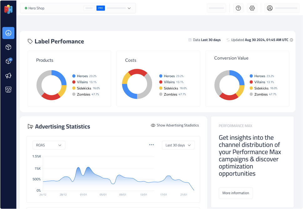 Producthero Labelizer agrupa automáticamente tus productos en función de su rendimiento, etiquetándolos como 'Heroes', 'Sidekicks', 'Villains' o 'Zombies'. Estas etiquetas se integran fácilmente en tu feed de productos, lo que te permite segmentar las campañas de manera efectiva y optimizar la asignación de presupuesto.