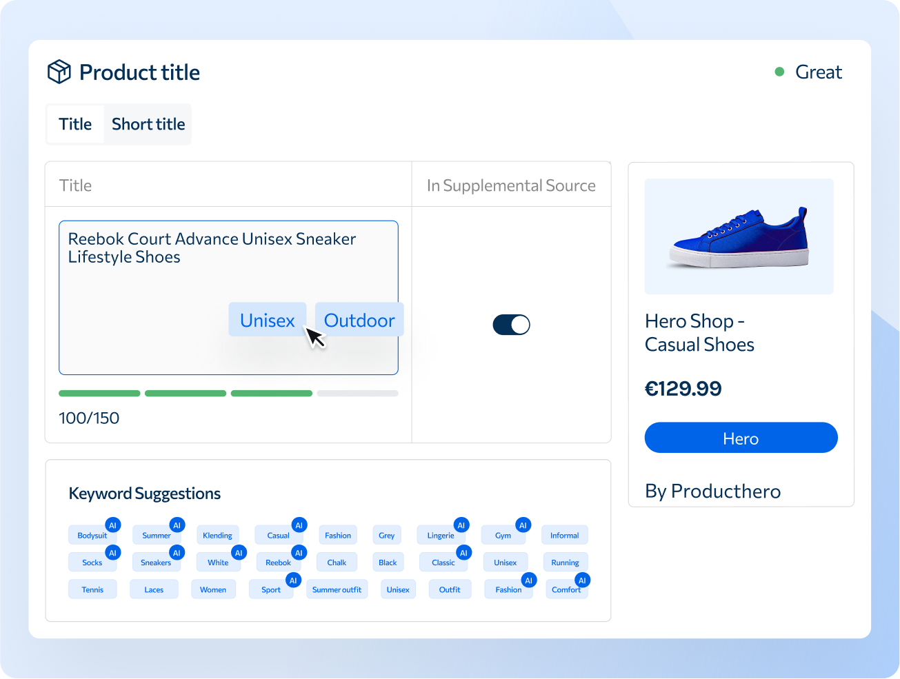 Enhance your product titles for Google with smart, data-driven recommendations and effortless editing.