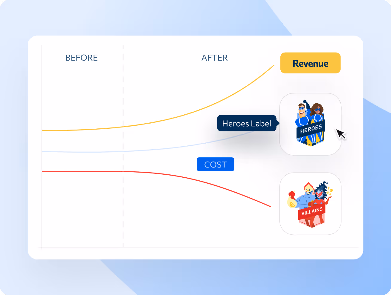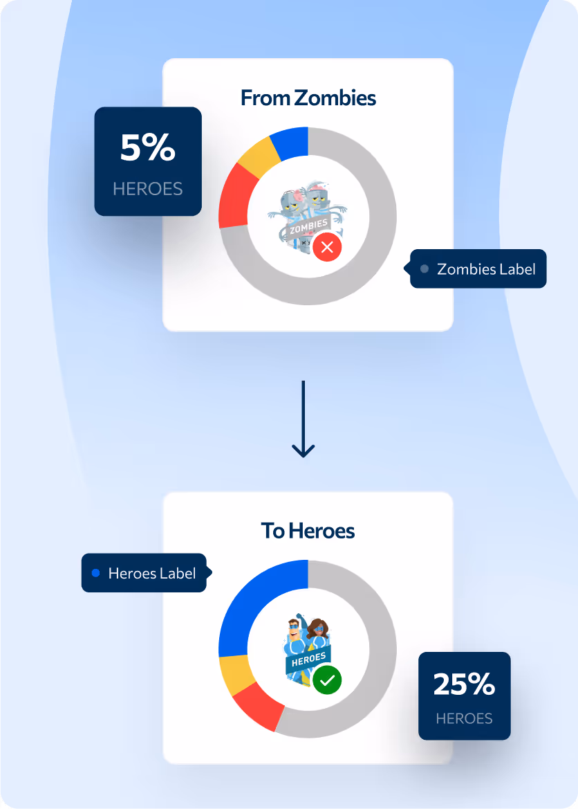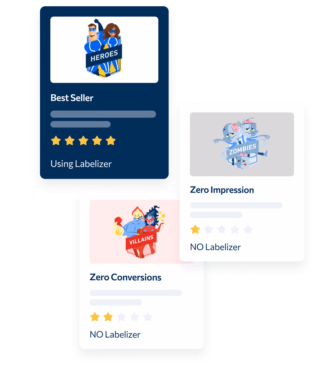 Producthero Labelizer analiza diariamente sus productos y los segmenta en función de su rendimiento. Los productos se clasifican en 4 etiquetas: Heroes, Sidekicks, Villains y Zombies.
