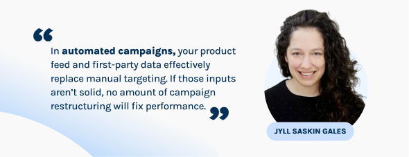 For Shopping and Performance Max, your product feed effectively defines both targeting and ads. Jyll called out three attributes to prioritize: