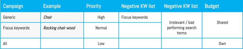 - Create an All products campaign with priority level Low and very low bids, to make sure that there is a safety net. This is very useful to see if products or search terms are not targeted in the structure. And also to make sure products can still show in price listings on the Google Shopping tab, even when negative keywords prevent that. The All products campaign gets its own budget.