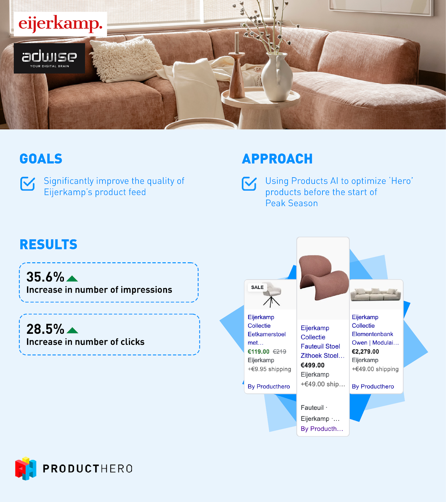 "Pe lângă faptul că am văzut o creștere uriașă atât a numărului de clicuri, cât și a numărului de impresii, Products AI ne-a ușurat foarte mult de muncă. Din cauza constrângerilor de timp, nu am putut obține informații mai bune despre produse din back-end-ul Eijerkamp și, prin urmare, am putut face pași uriași către un feed de produse mai bun cu puțin efort manual."